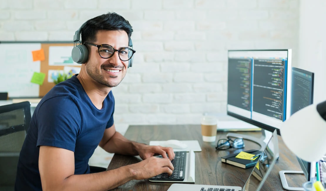 Smiling man wearing headphones and glasses typing on a keyboard at a desk with computer monitors displaying code